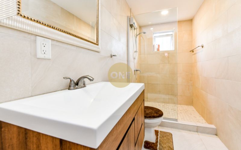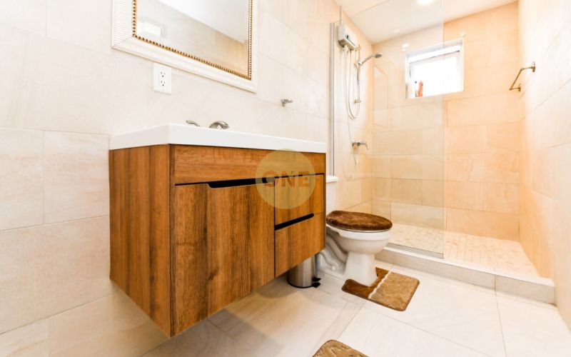 The spacious bedroom features a comfortable king-size bed and generous built-in closet space, providing both style and functionality. The contemporary bathroom includes hot water and practical under-sink storage for added convenience.