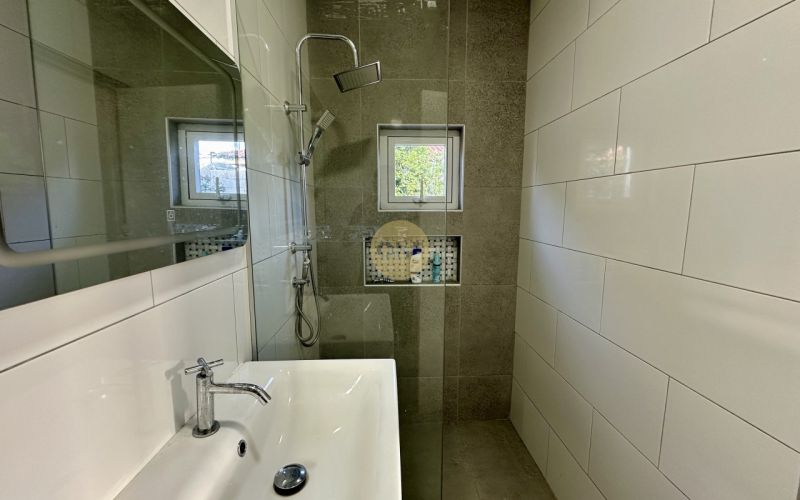 Adjacent to the main living area are two bedrooms that share a modern bathroom. The property is fully enclosed with a privacy fence, creating a secure, private setting. It’s shared with two other apartments, adding a cozy sense of community.