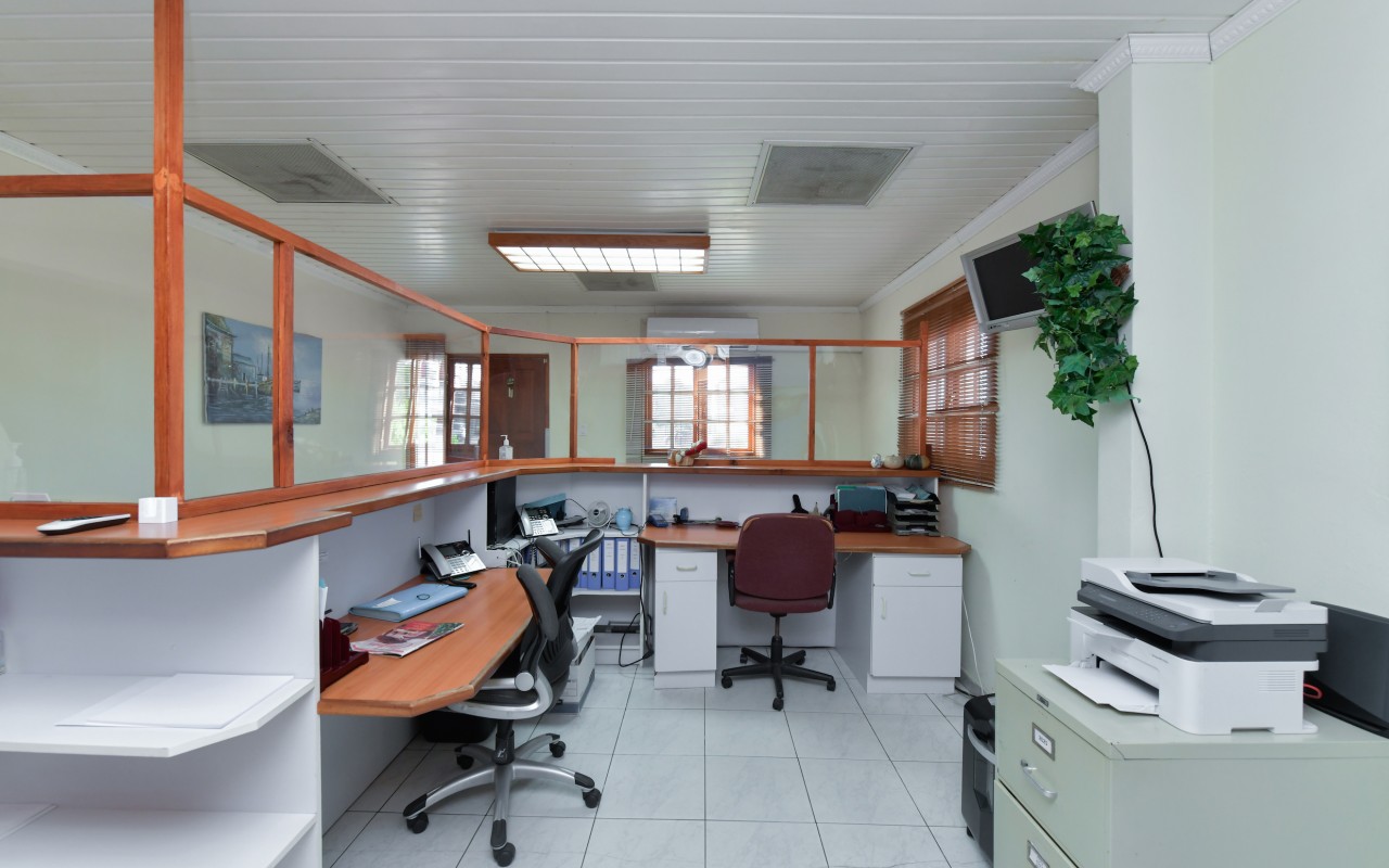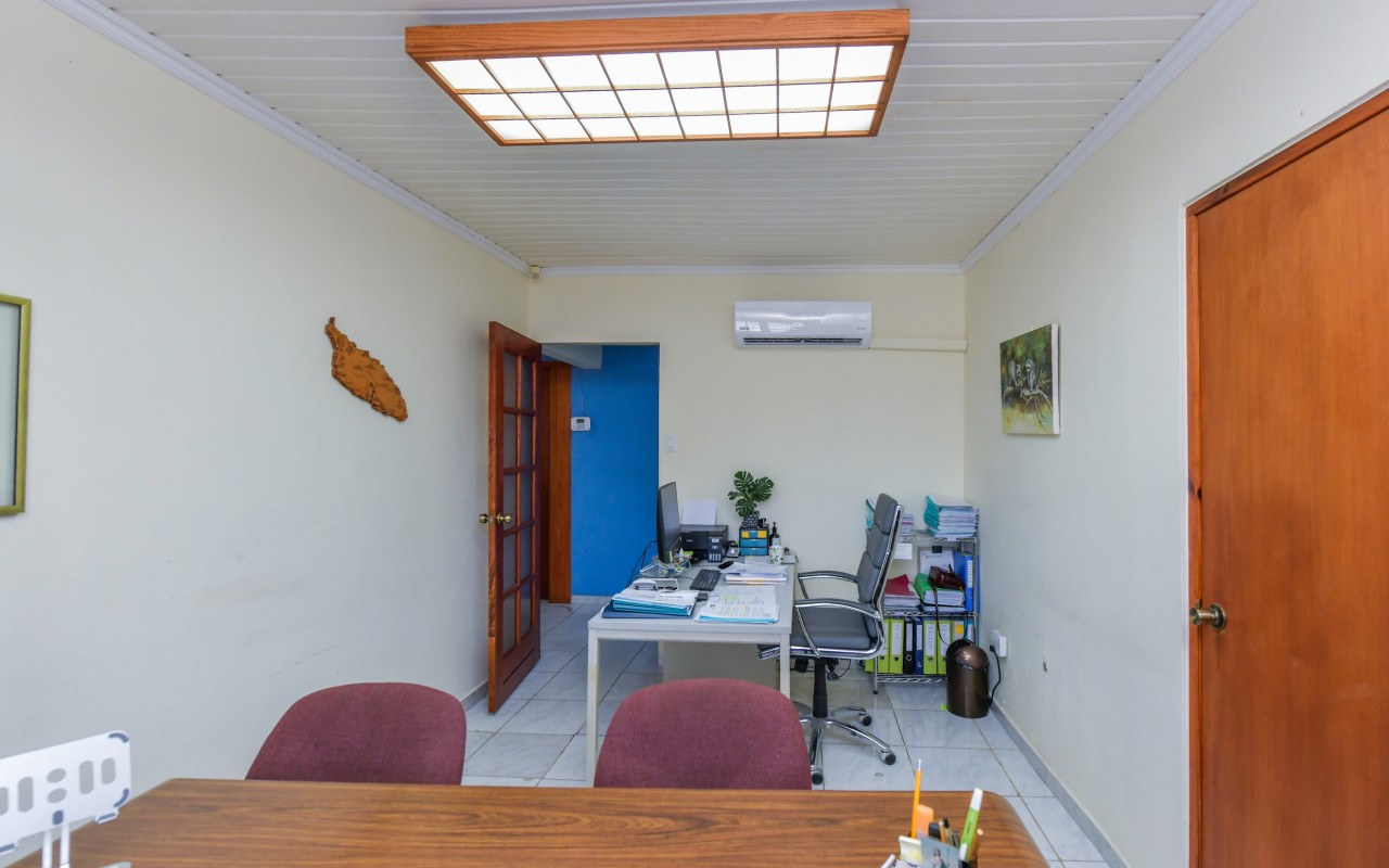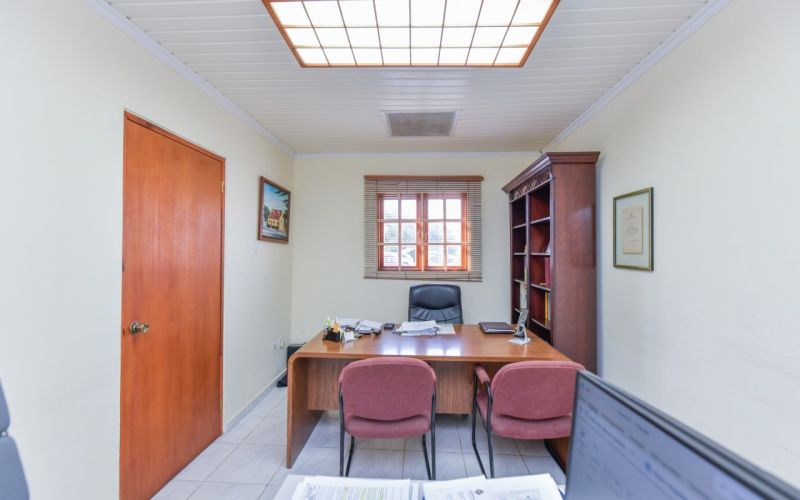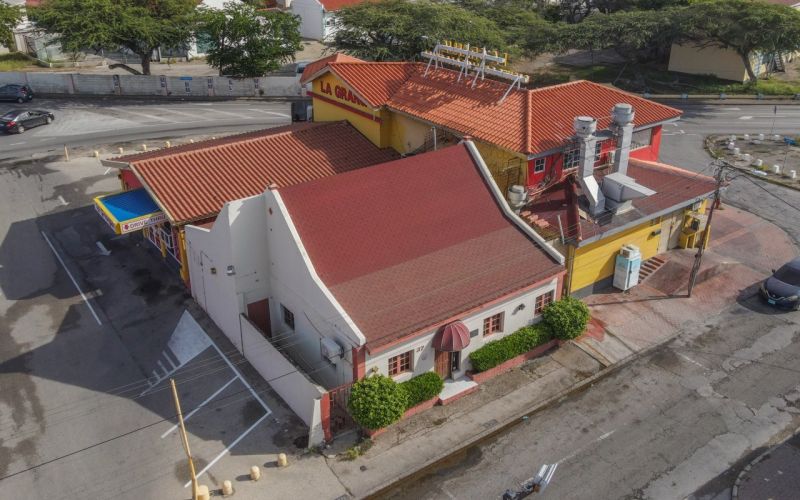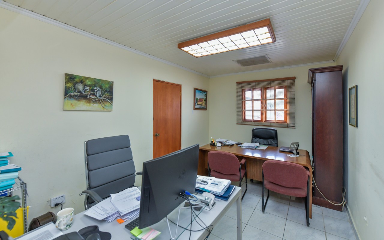 Located in the vibrant center of Oranjestad, this well-positioned commercial property offers approximately 180 m² of built-up space on 144 m² of long-lease land. The ground floor features a welcoming reception area, three enclosed offices, a kitchen/pantry, and a storage/archive room. Upstairs, a spacious 55 m² attic provides flexible options for additional workspace, storage, or potential living quarters—ideal for a live-work concept.